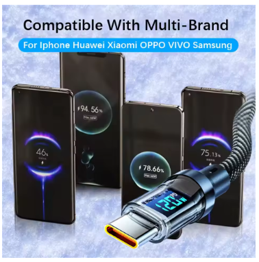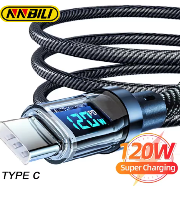 NNBILI 120W USB-C naar USB-C Oplaadkabel met LED-display Een supersnelle oplaadkabel met een LED-display, compatibel met apparaten zoals Huawei, Oppo en Vivo, en ondersteunt opladen tot 120W.